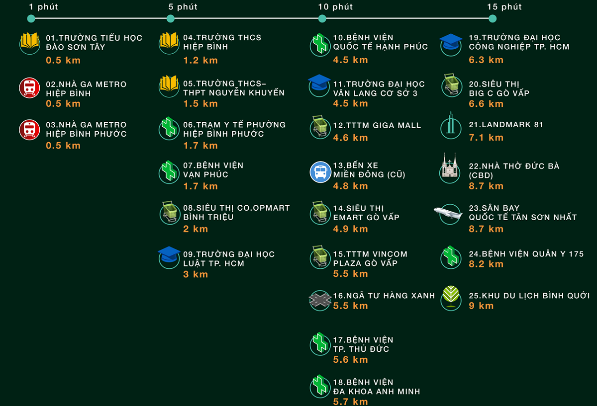 - 05 phút di chuyển đến trường THCS Hiệp Bình, trạm y tế phường Hiệp Bình Phước, bệnh viện Vạn Phúc, siêu thị Co.op Mart Bình Triệu, trường ĐH Luật Thành phố Hồ Chí Minh,…