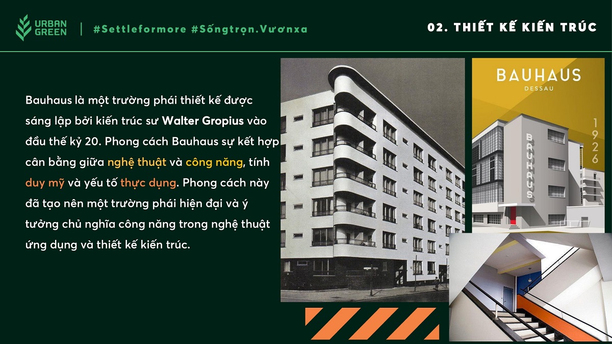 Urban Green mang phong cách Bauhaus điển hình với thiết kế cân bằng giữa nghệ thuật kiến trúc và công năng. Yếu tố cân bằng được thể hiện xuyên suốt trong tổng thể từ quy hoạch tới chi tiết kiến trúc mặt ngoài và bố trí không gian căn hộ.